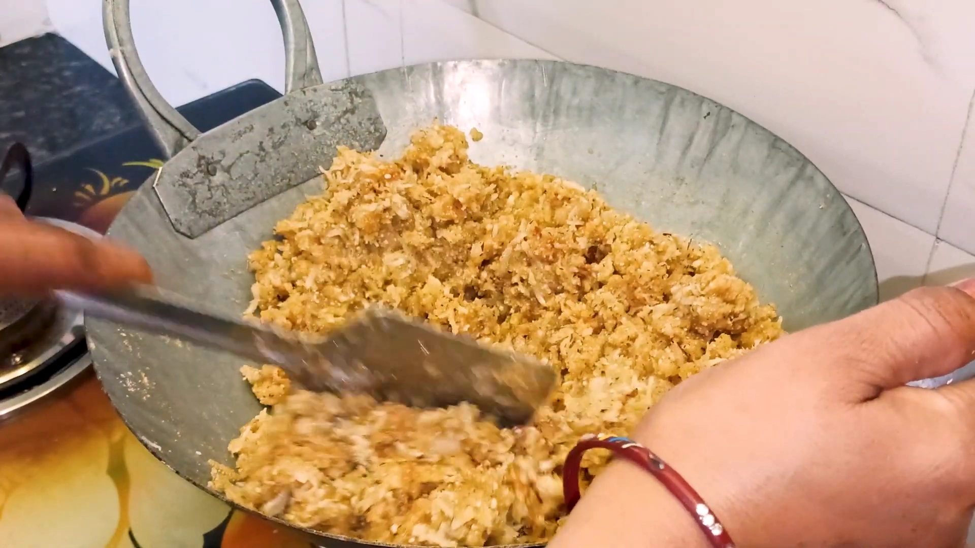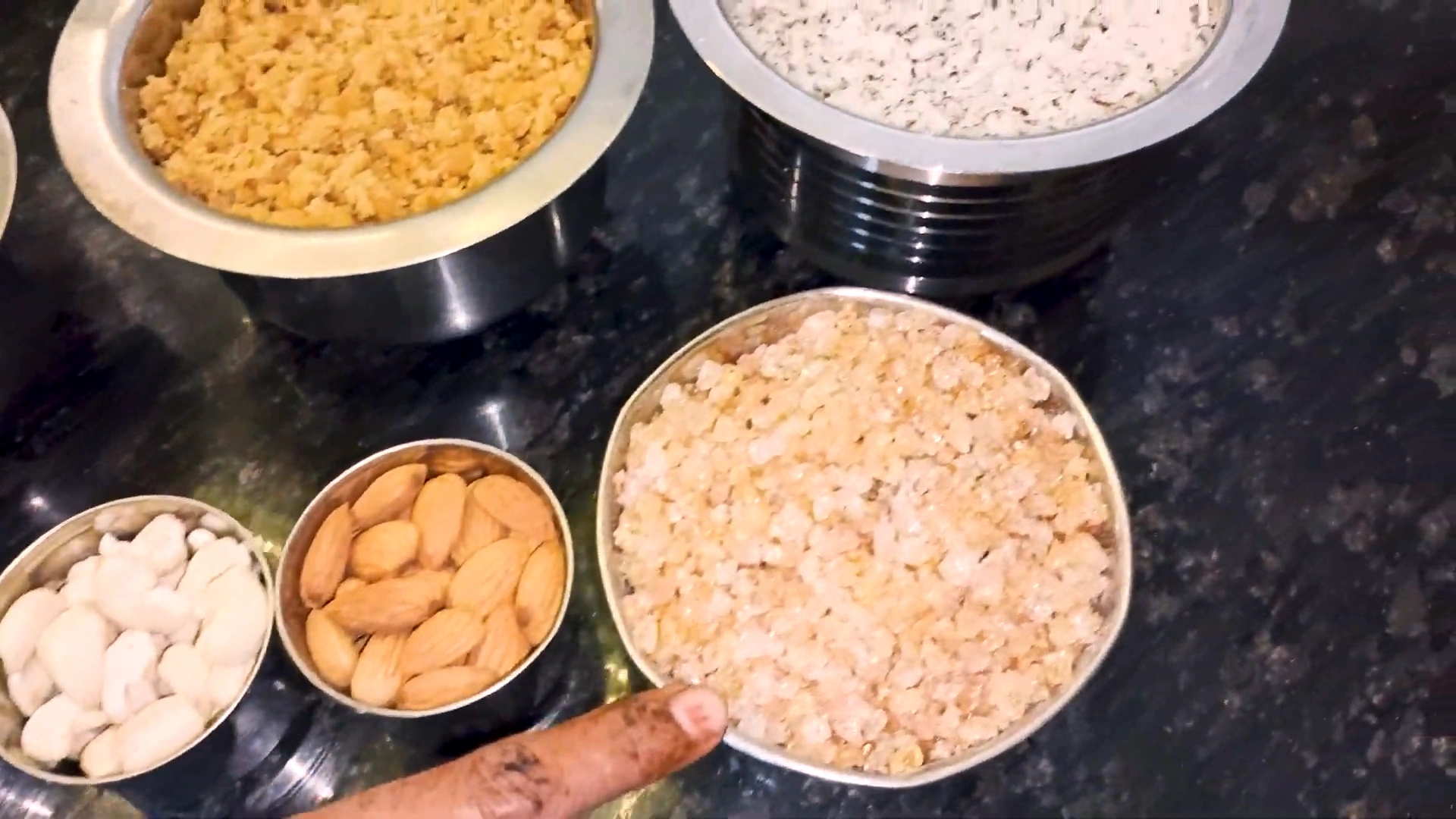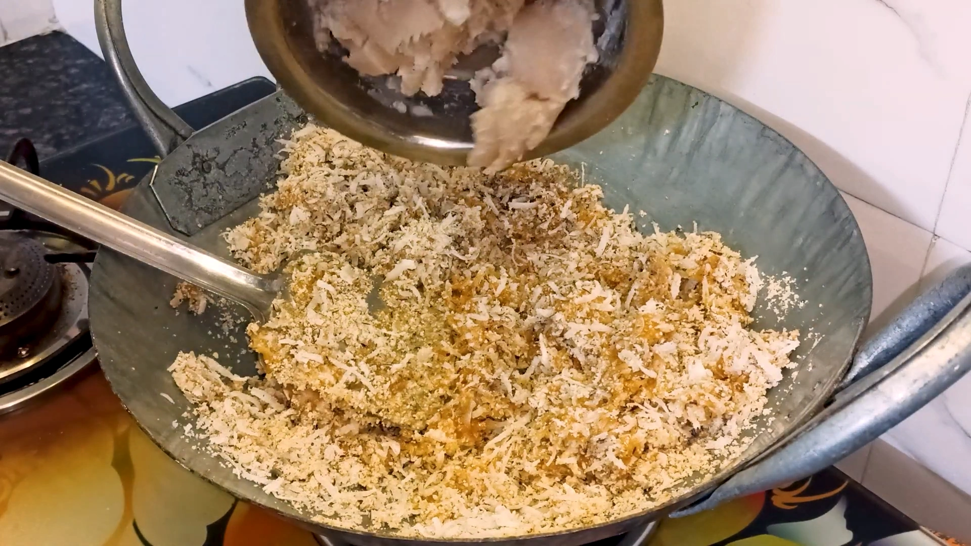Add cashew, almond, nut powder, mix well on law flame, Add gond on mixture, and mix well