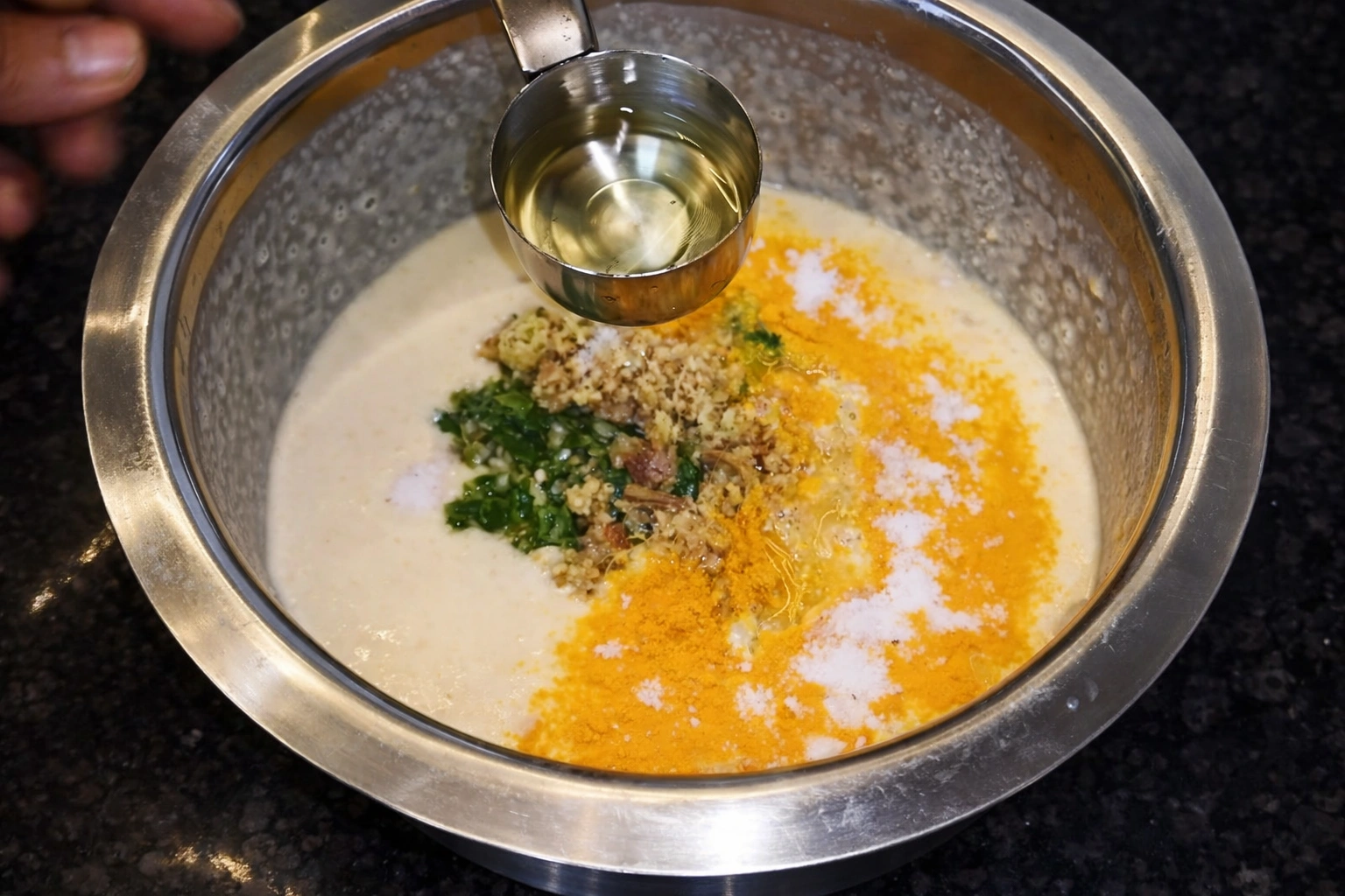 after 15 minutes remover cover and add green chilli paste grated ginger turmeric powder, salt and mix, add lemon juice, add oil
