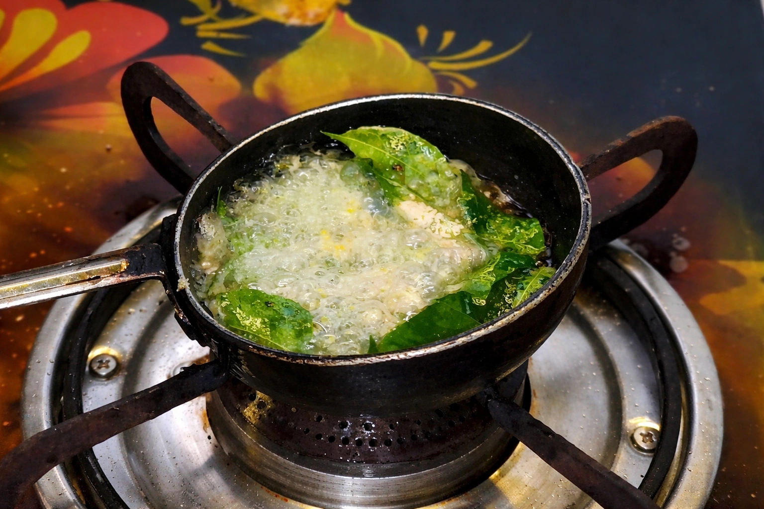 take 2 tbsp oil on small pan add mustard seed, than add curry leaves, add chopped green chilli, add asofoetida