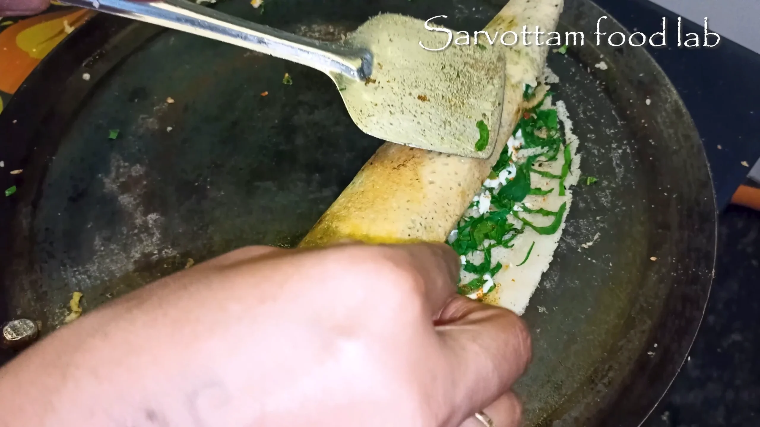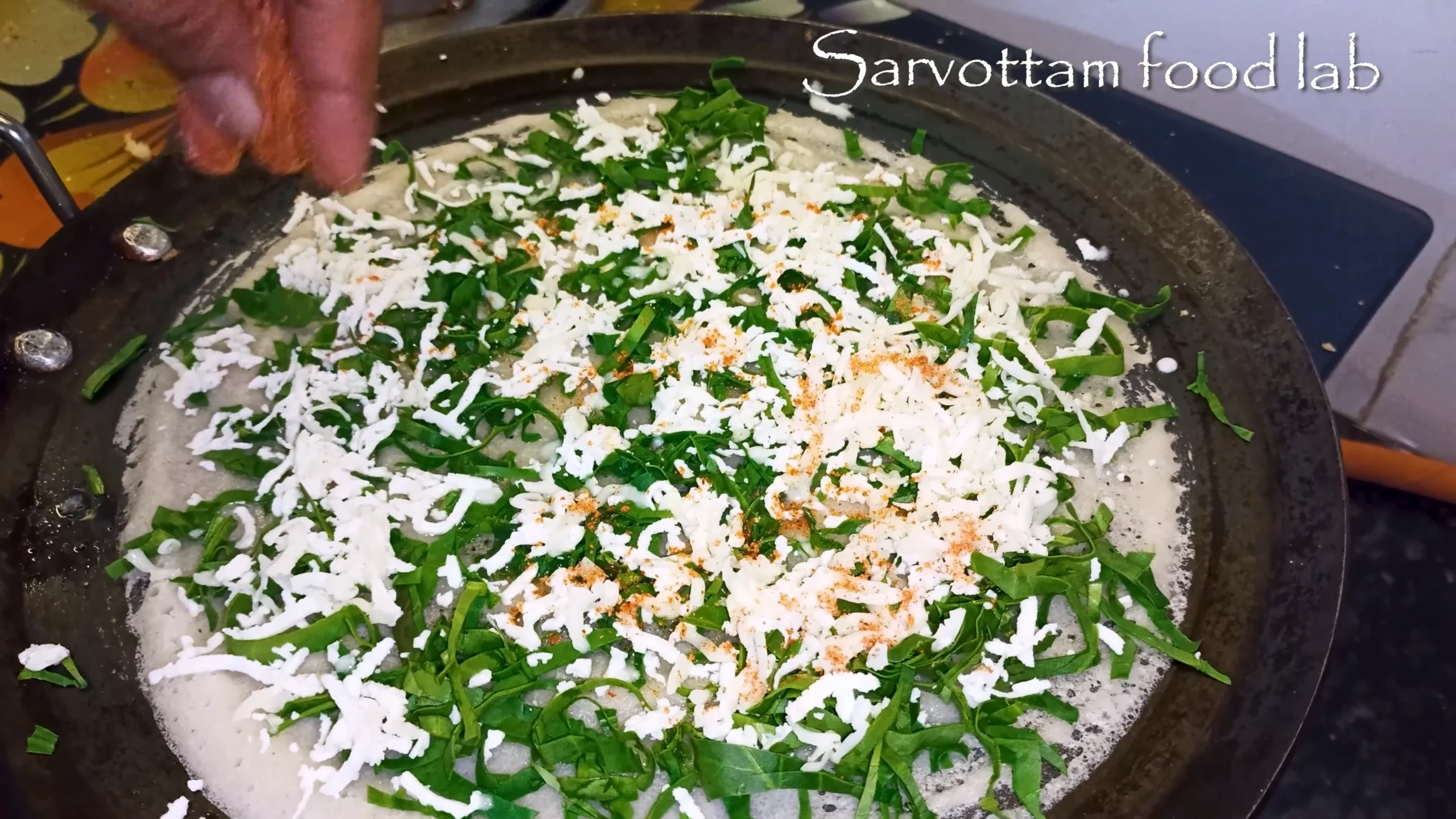spread, chopped palak, add grated paneer, cheese, fresh coriander, and sprinkle some dosa masala