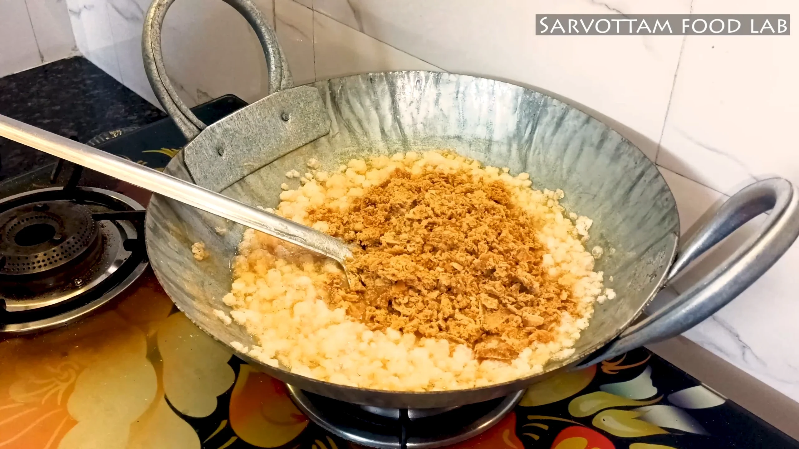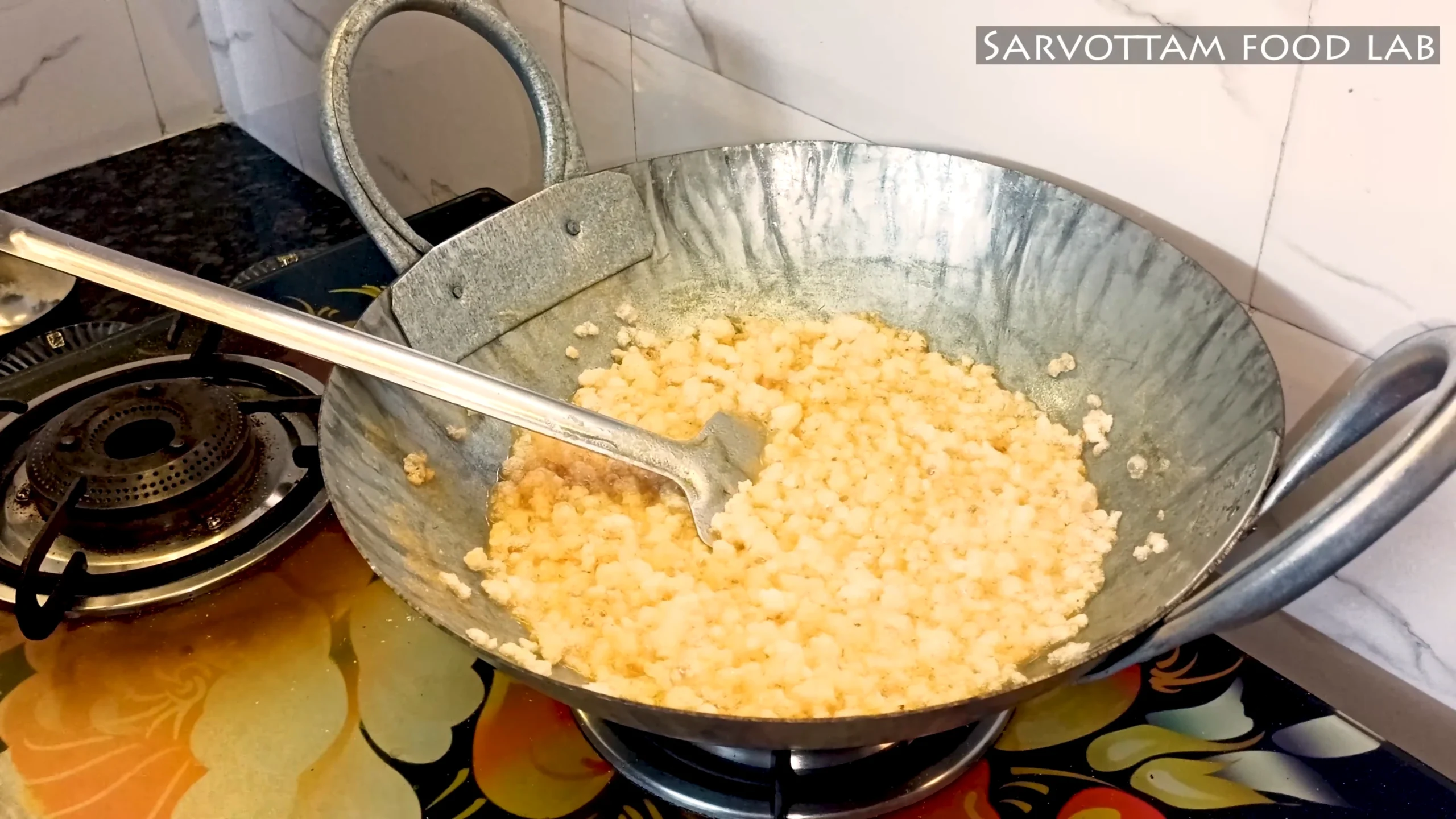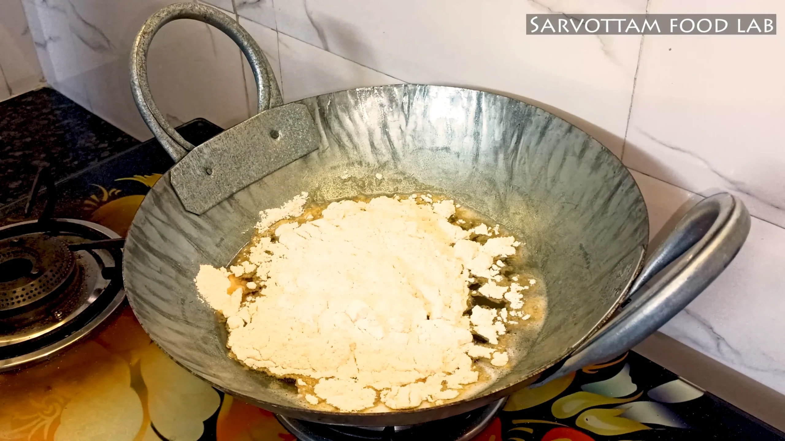 add 500gm aata flour and roast for 15 minutes on slow flame