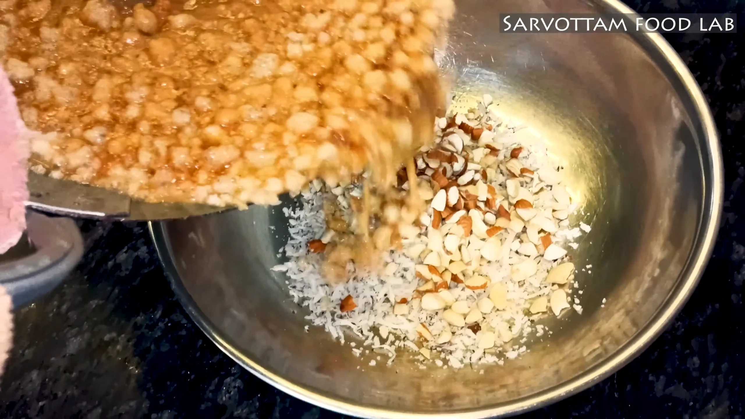 take pan add 1 grounded dry coconut, chopped almond, cashew