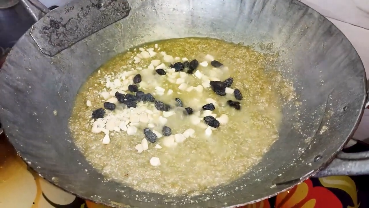 add milk, add sugar, add cashew, add black dry grapes